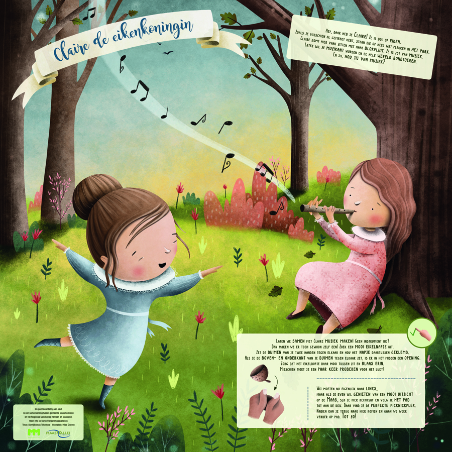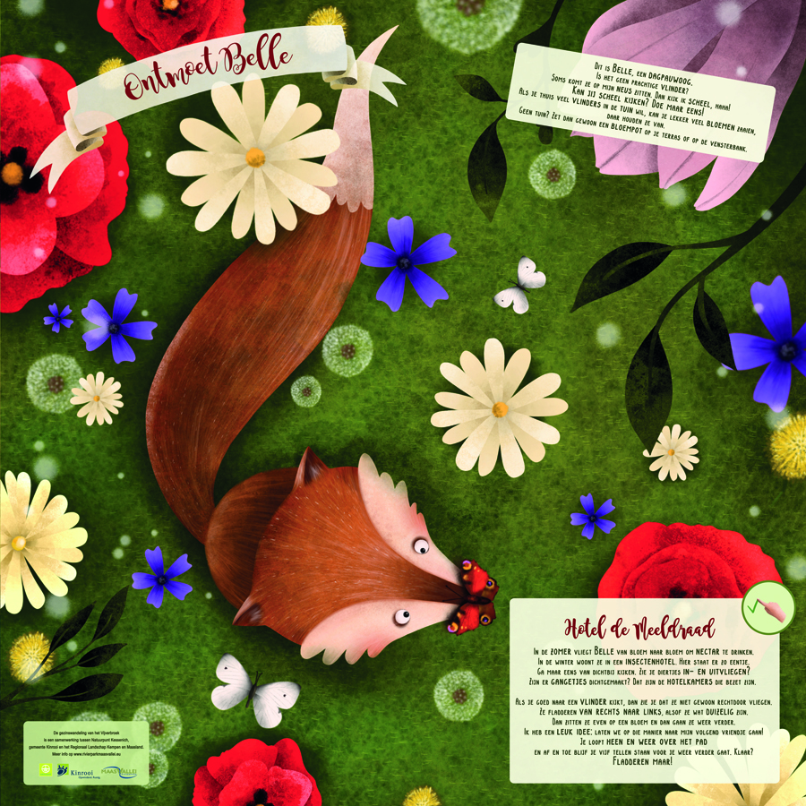 Ik bedacht de doedingen, schreef de teksten en zocht mee naar een illustrator. Dat werd Hilde Groven uit Hasselt. Haar prachtige tekeningen maken dat kinderen al van ver tot de borden worden aangetrokken. Ze verzorgde ook de vormgeving.