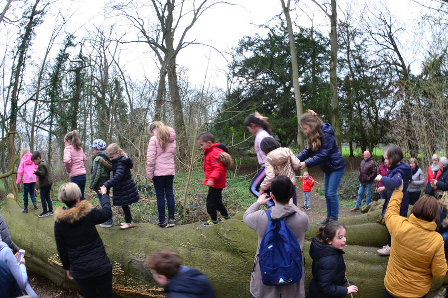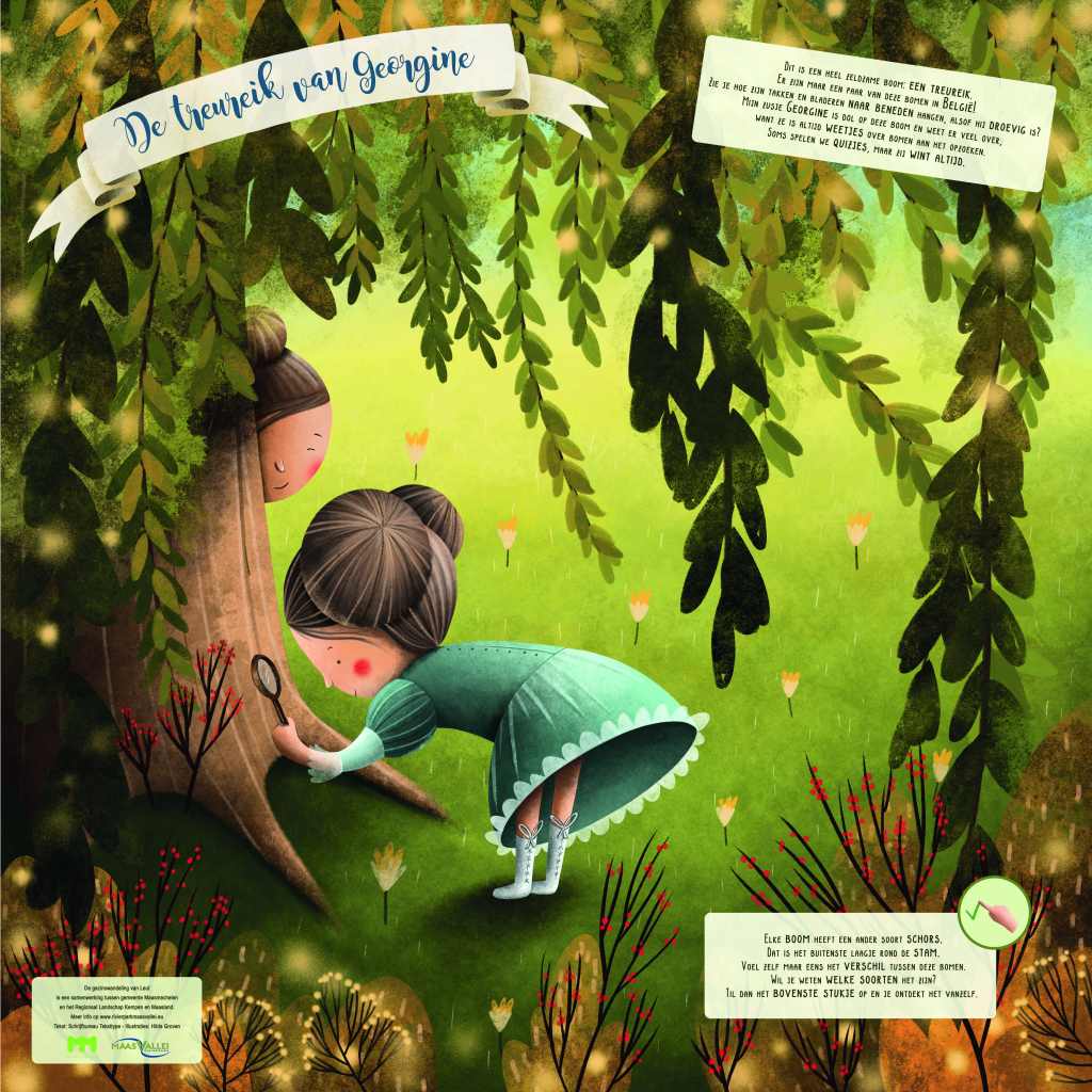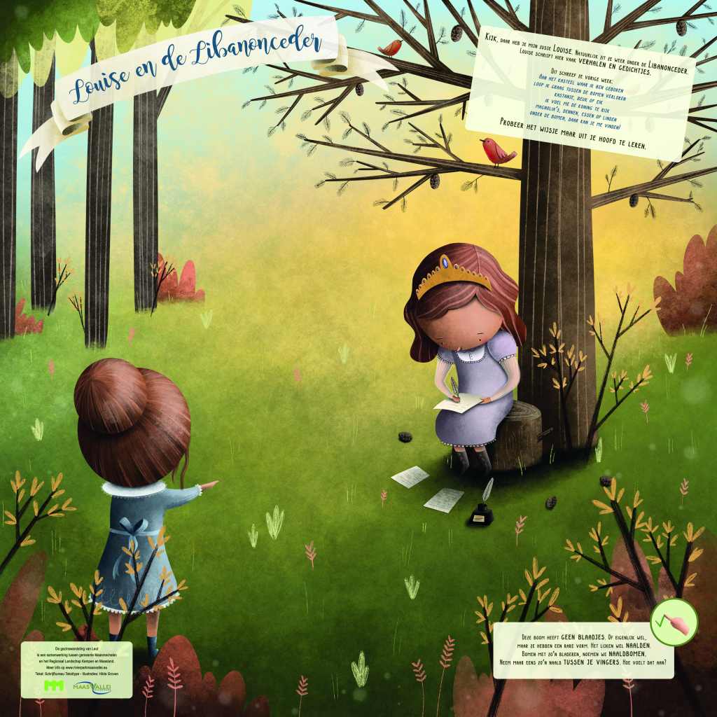 Een doetocht voor kleuters in het kasteelpark in Leut (Maasmechelen) met behulp van infoborden. De zeven dochters van de kasteelheer dagen de kinderen uit om samen te dansen, rijmpjes te bedenken, te knutselen, muziek te maken en aan natuuronderzoek te doen. Ik bedacht ook een bomendrumstel en de ‘voelbomen’ die de wandeling nog interactiever maken.