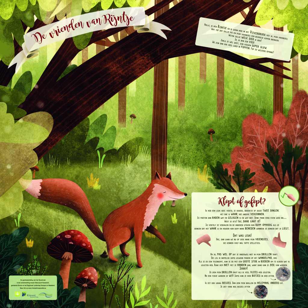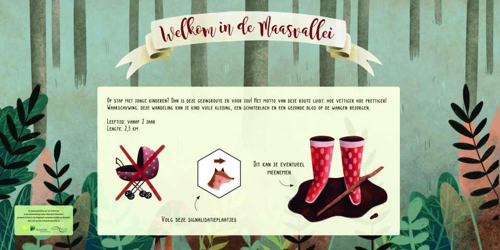 Voor RivierPark Maasvallei, een van de projectbureaus binnen Regionaal Landschap Kempen en Maasland (RLKM), bedacht en schreef ik de inhoud voor twee doetochten voor kleuters. Via infoborden worden de kinderen aangemoedigd om de natuur met alle zintuigen te beleven. Ik bedacht ook wat extra belevingselementen, zoals een ‘bomendrumstel’ en ‘voelbomen’.