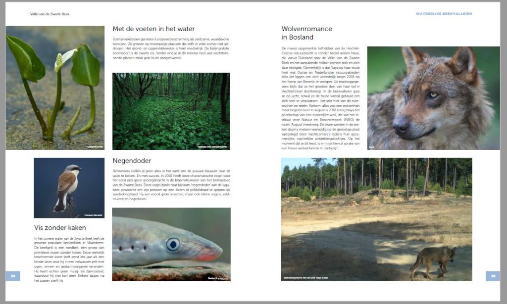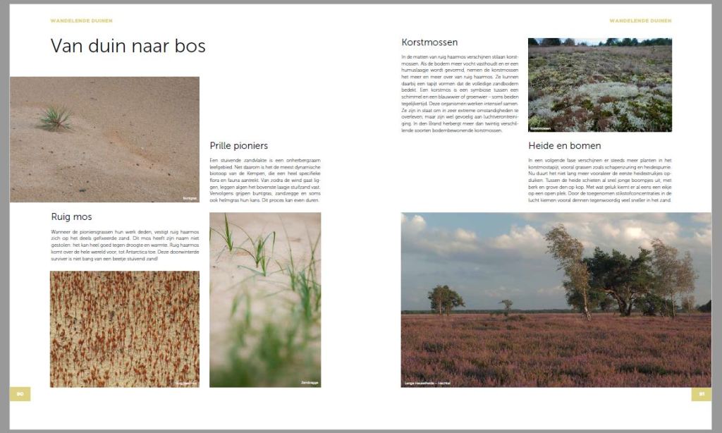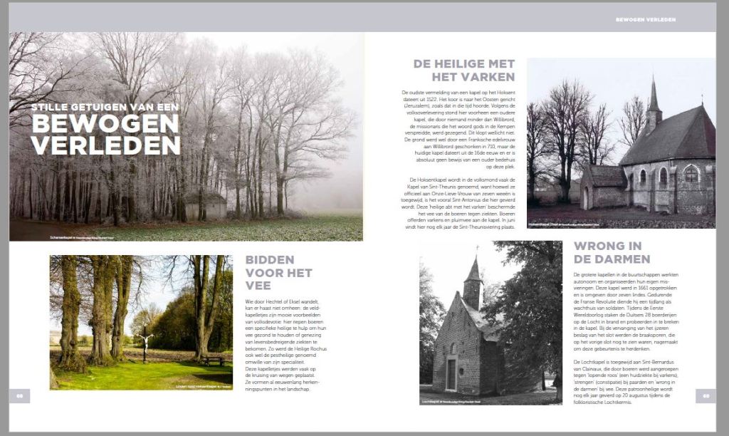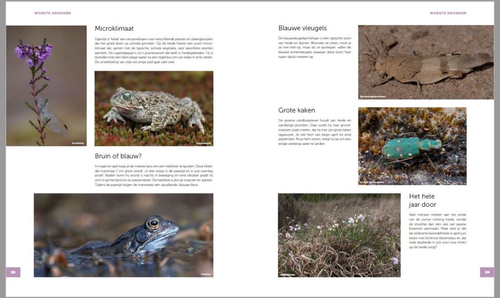 Een indeling bepalen, research doen, teksten schrijven, spreken met lokale natuurkenners, de boswachter en de voorzitster van de Heemkundige Kring om zo een boek vorm te zien krijgen: heerlijk! De foto’s zijn van de hand van Theo Geuens, een fotograaf uit de gemeente, en de lay-out werd verzorgd door Luc Schreurs, met wie ik regelmatig samenwerk.