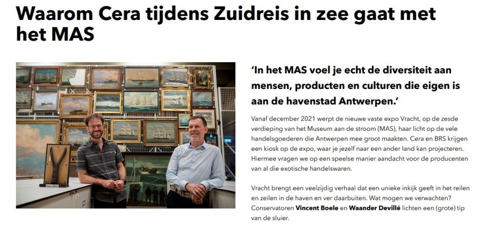 Daarnaast schreef ik teksten voor ‘Zuidreis’, een project van BRS en Cera. Van 15 oktober 2021 tot 6 maart 2022 kunnen Cera-vennoten op wereldreis in Antwerpen. Een route leidt hen langs drie musea (het MAS, Chocolate Nation en het Snijders&Rockoxhuis) en allerlei zuiderse adresjes in de havenstad.